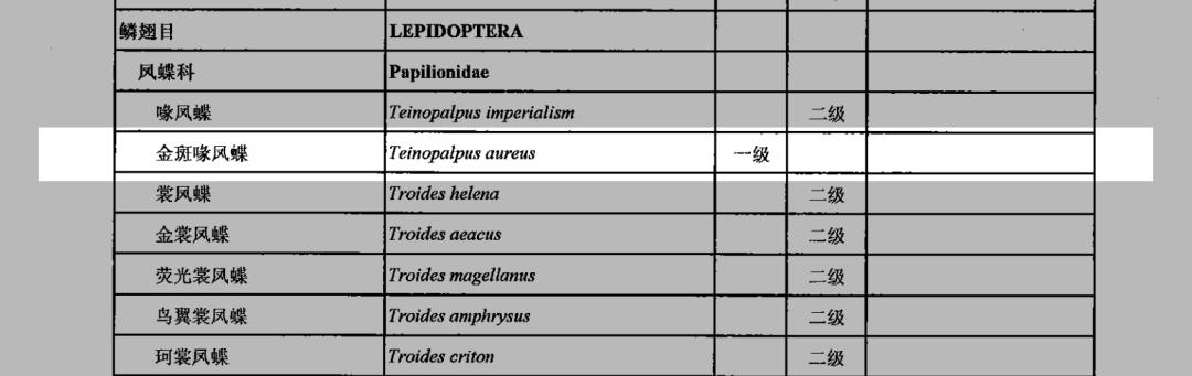 在2021年2月5日公布的新调整的《国家重点保护野生动物名录》中,金斑喙凤蝶为国家一级重点保护野生动物。金裳凤蝶:中国最大的蝴蝶