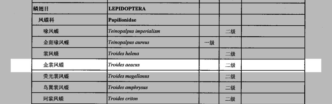 在2021年2月5日公布的新调整的《国家重点保护野生动物名录》中,金裳凤蝶为国家二级重点保护野生动物。宽尾凤蝶:中国特有