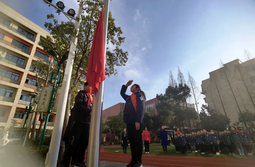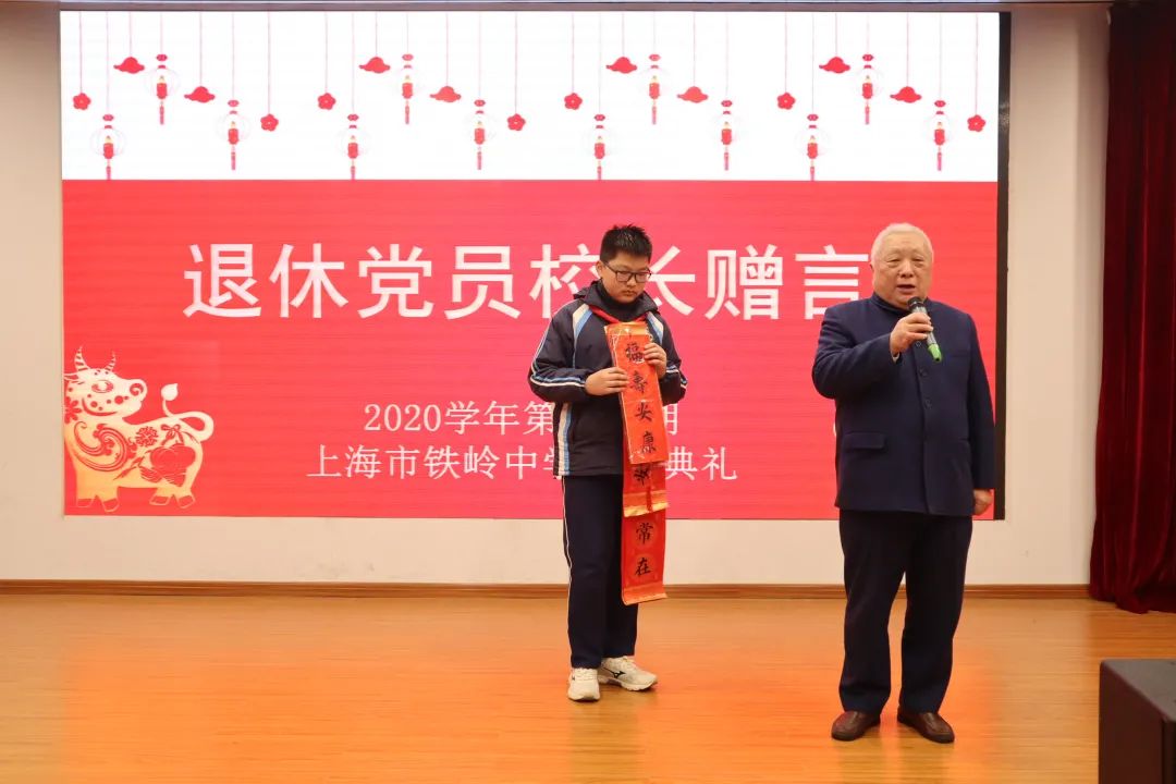 奏唱国歌之后,校长张贤臣总结了学校上一学期的成绩,号召大家继续发扬牛的“刻苦、踏实、坚韧”精神;老师向大家展示了寒假“新年春联秀”活动中的精彩作品,初一(4)班阮君昊同学将自己亲笔书写的对联赠送给退休党员校长吴永光。老校长吴永光也对全校师生提出了要求和希望,号召同学们筑起忠诚、担当、奉献的信念,长大后为人民谋福利。