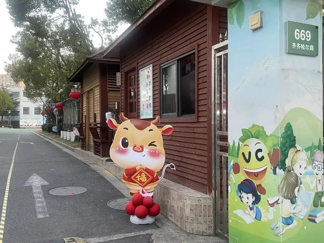 红红火火!来抽一张福卡吧齐齐哈尔路第一小学的校门口,一只写着福字的卡通小牛,以作揖的动作欢迎每位走进校园的孩子。各年级进入校园采取错峰措施,五年级7:50进校;三、四年级8:00进校;一、二年级8:10进校。