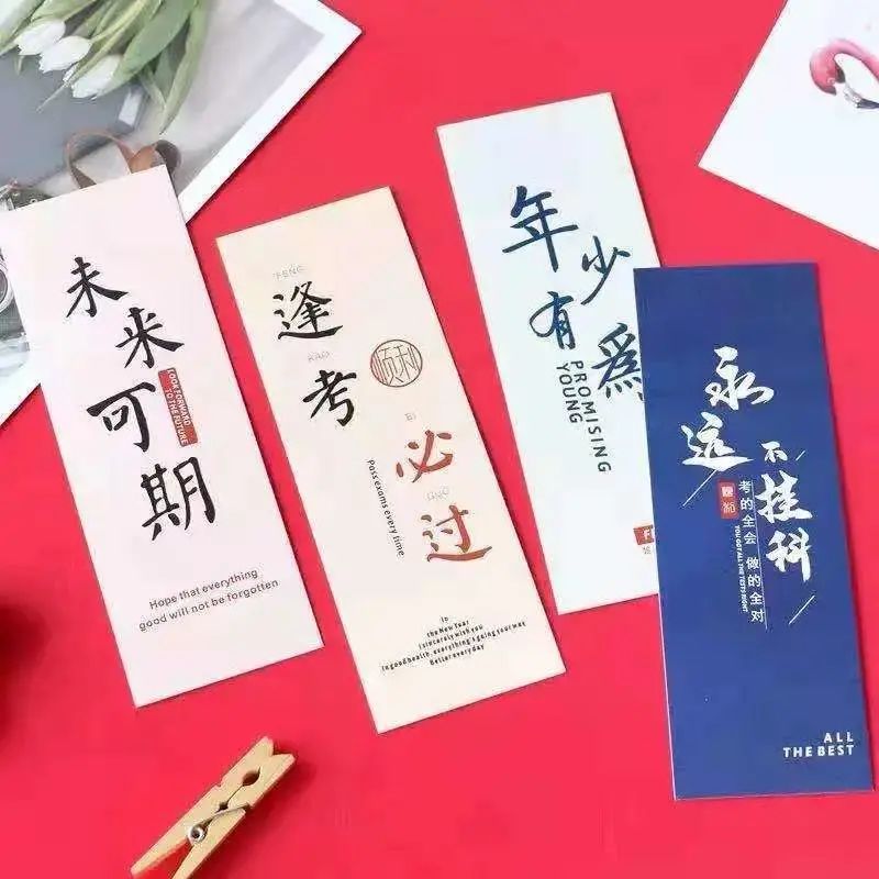 执勤的少先队员捧着礼盒,里面装着福卡,也就是小书签,每位学生进来都抽上一张,上面写有“未来可期”、“年少有为”、“逢考必过”等各类祝福的话语。