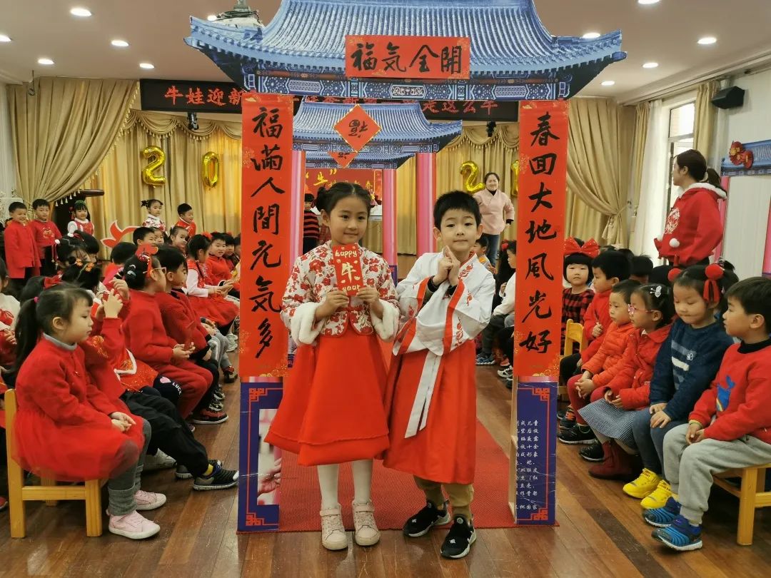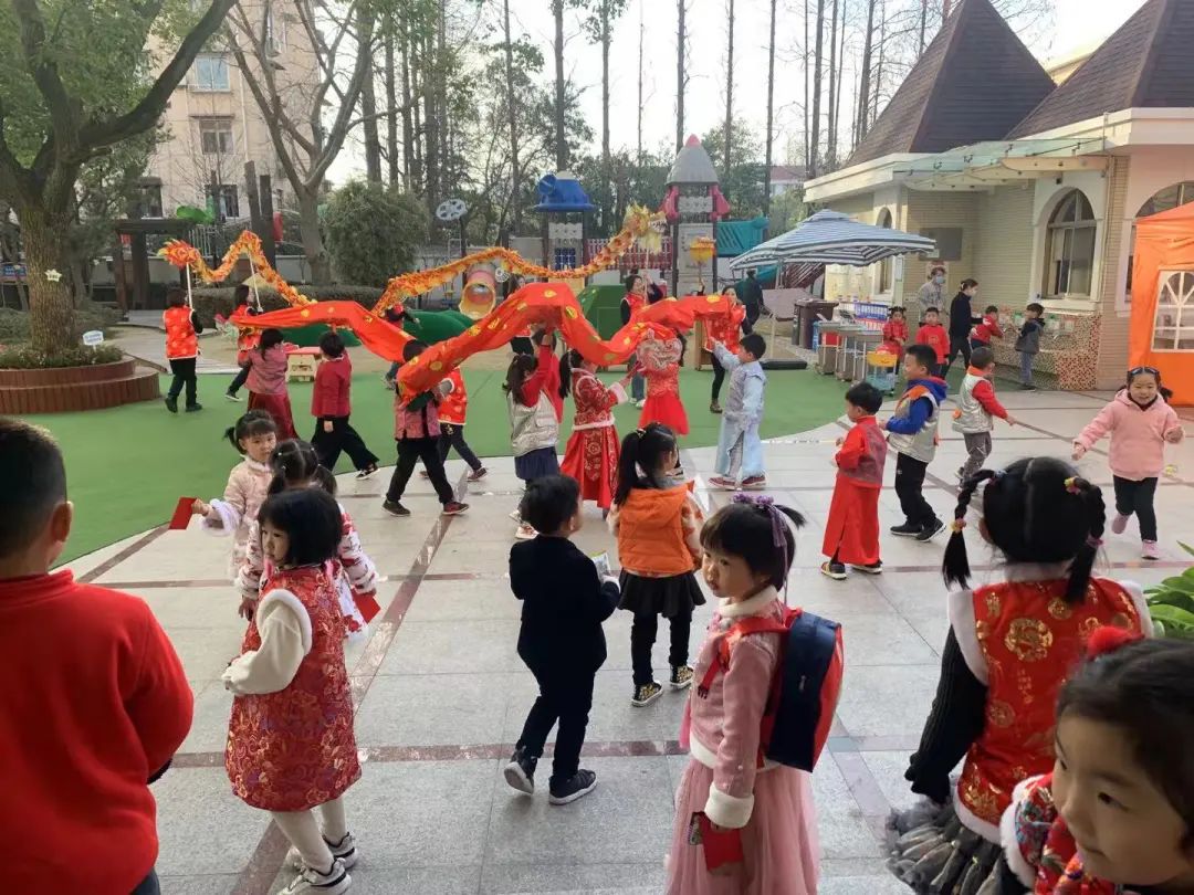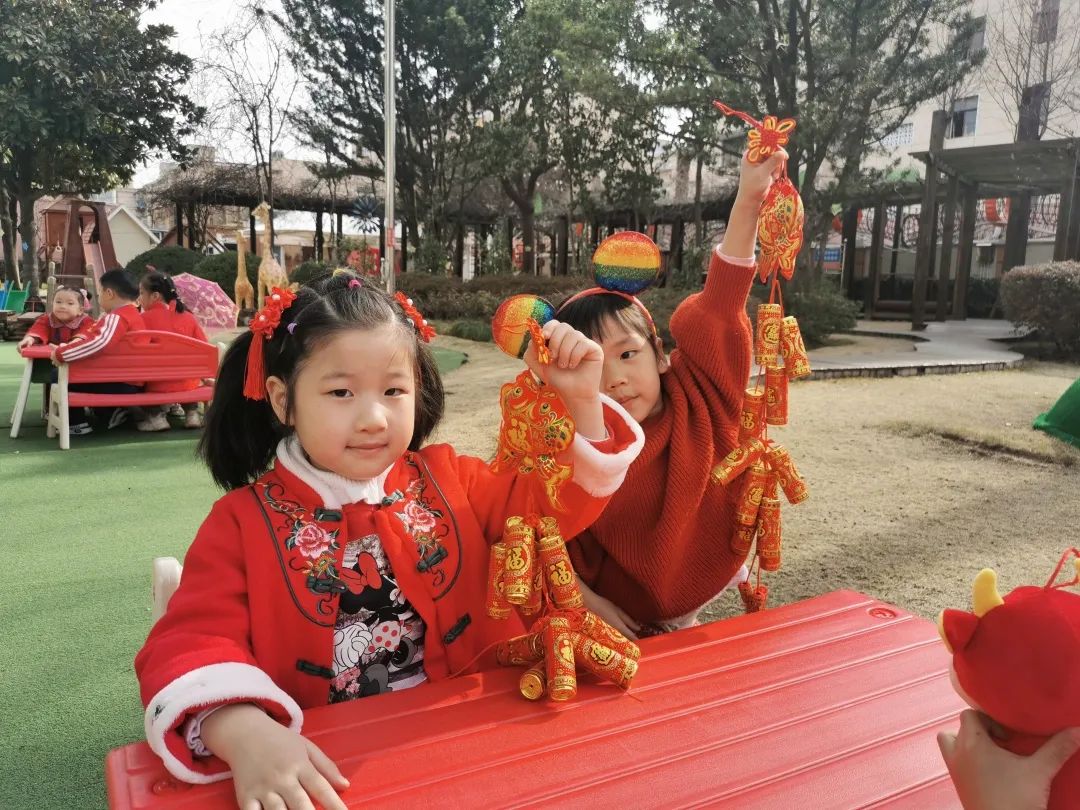 “新年快乐!”声音刚落,小朋友小铃铛就收到一个“惊喜红包”。红包里面的内容各不相同,像抽盲盒一样,有的是一张“卡通牛”简笔画,有的是一张贴纸,有的则是老师们写下的新学期祝福……小铃铛还没来得及打开红包,就被园内更大的惊喜吸引了:一条条红色的长龙在小伙伴们的手中起舞。在老师的指导下,长龙左扑右闪,十分威武。