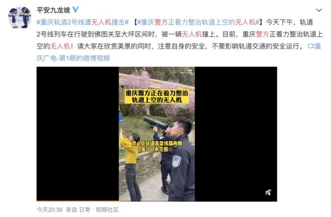 22日,重庆轨道交通微信公众号发布消息,提醒游客欣赏美景的同时,一定注意安全。重庆轨道交通表示,根据《城市轨道交通运营管理规定(中华人民共和国交通运输部令2018年第8号)》第三十四条规定,禁止下列危害或者可能危害城市轨道交通运营安全的行为:在地面或者高架线路两侧各100米范围内升放风筝、气球等低空飘浮物体和无人机等低空飞行器。违者将依法追究相关责任。