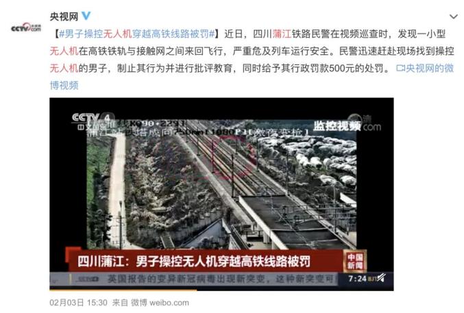 2月,四川蒲江一男子操控无人机在高铁线路上方来回飞行,被处以500元的罚款↓