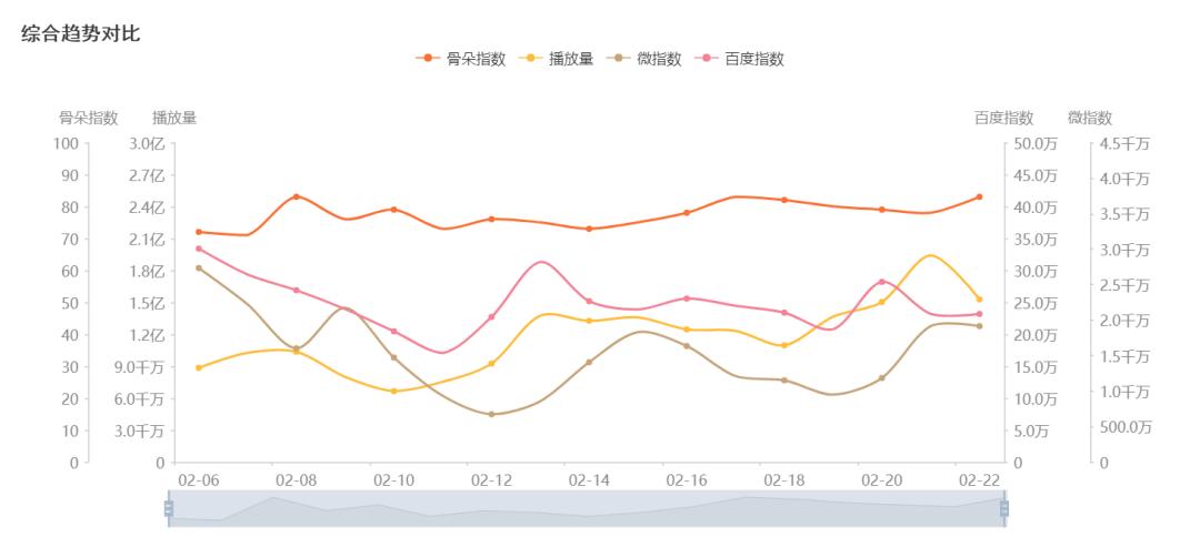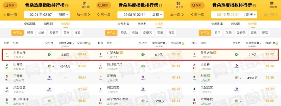 《斗罗大陆》的单日播放量、百度指数、微指数等数据也在剧情进入后半程后迎来一个高峰,它的单日播放量连续多日破亿,百度指数和微指数也在2月19日后由平缓前进变为持续上升,证明《斗罗大陆》在开局时凭借世界观的快速铺陈吸引到的大批受众,在后期得以被保留,剧情的后劲十足。