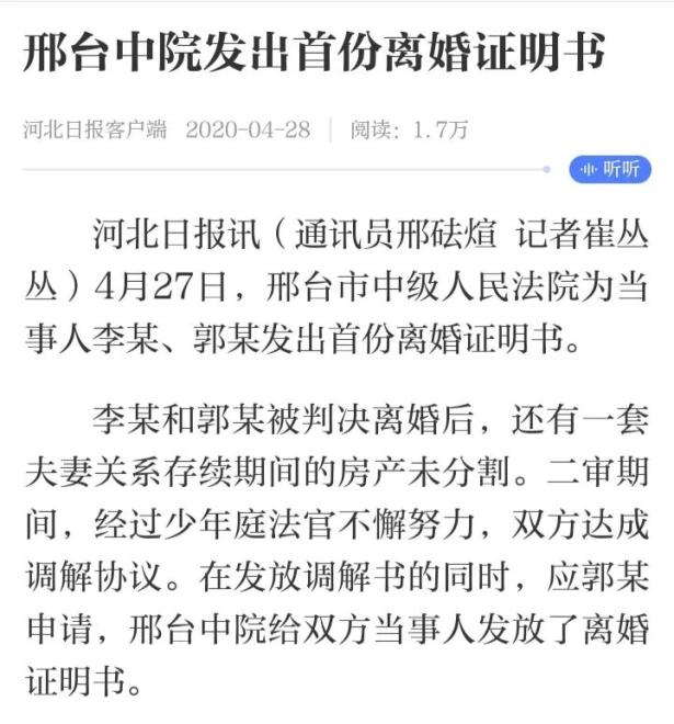据了解,当事人郭某拿到的是邢台市法院出具的首份《离婚证明书》。