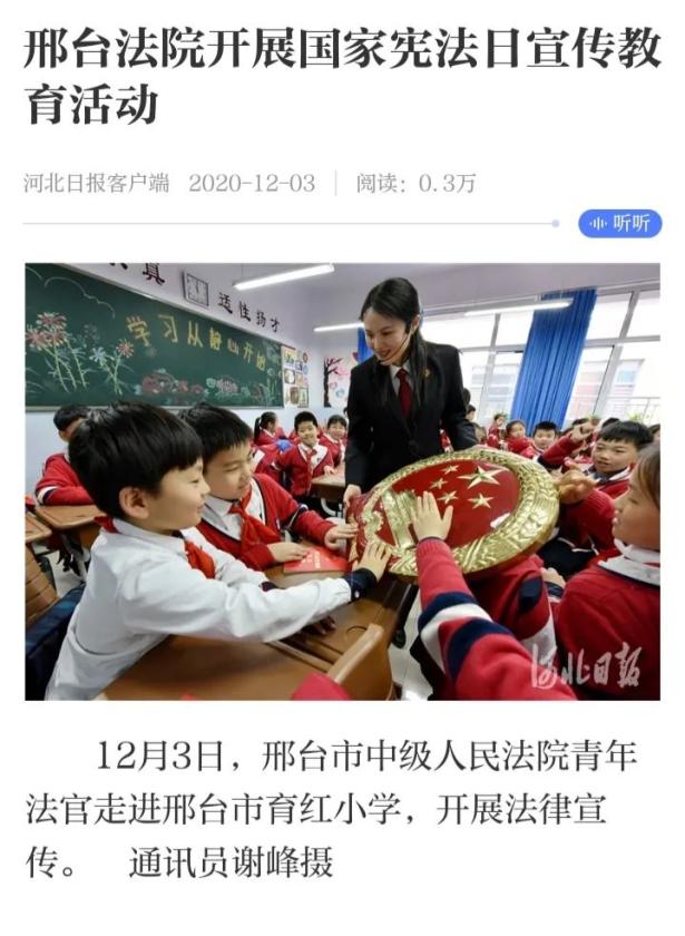在国家宪法日来临之际,邢台法院还组织法官走进马路街小学、邢台军分区等地,通过授课、座谈等形式开展系列宣传活动,弘扬宪法精神。