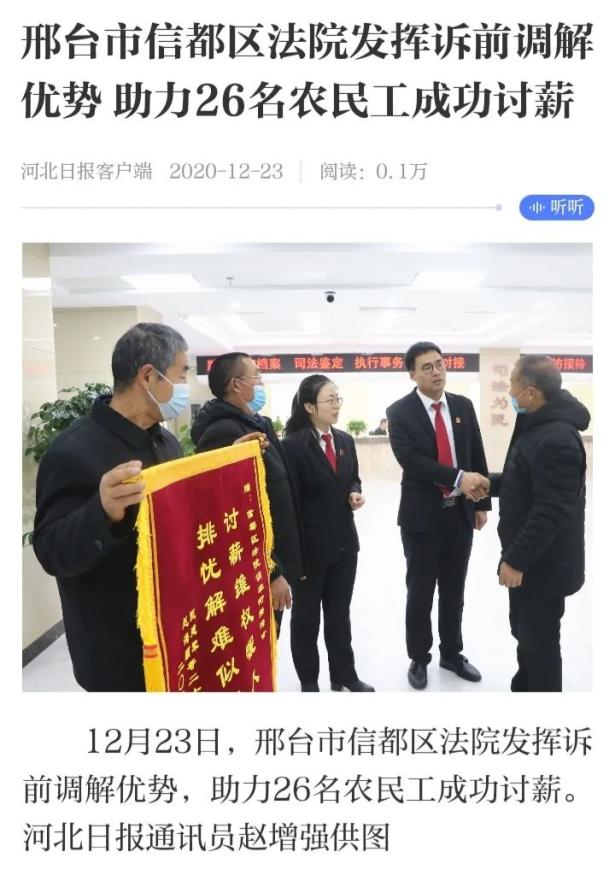 原标题:《邢台市新都区法院发挥诉前调解有事 助力26名农民工成功讨薪》