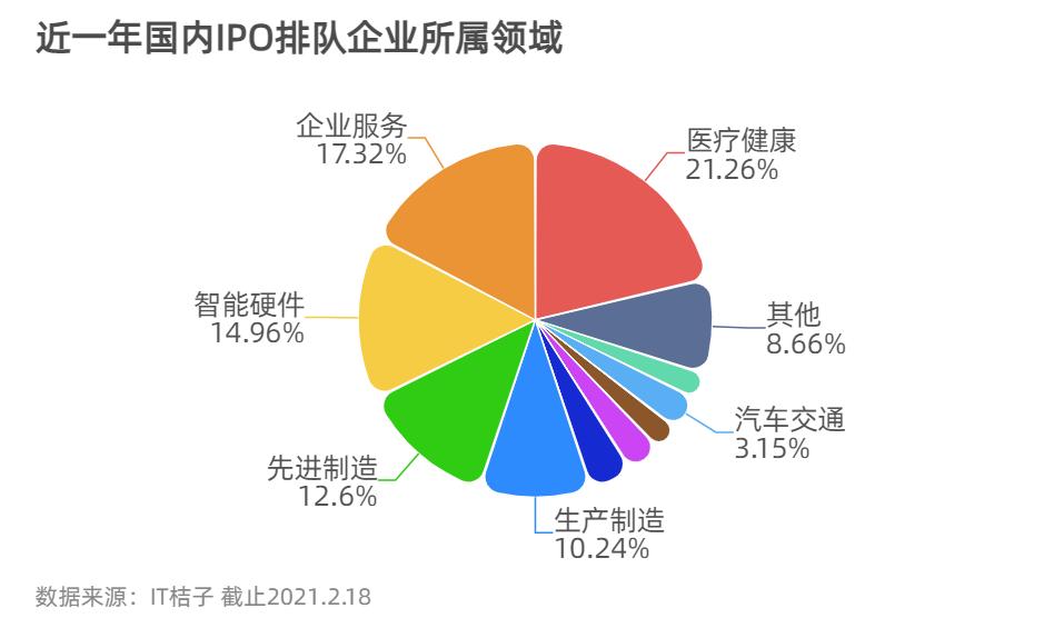 从所属行业来看,医疗健康、企业服务、智能硬件就占了国内 IPO 企业排队的一半多,智能制造产业、汽车交通、金融、教育等其他产业合计占比约 46%。医疗领域中,生物抗体药物研发商「天演药业」,医疗独角兽「诺禾致源」提交了注册申请;