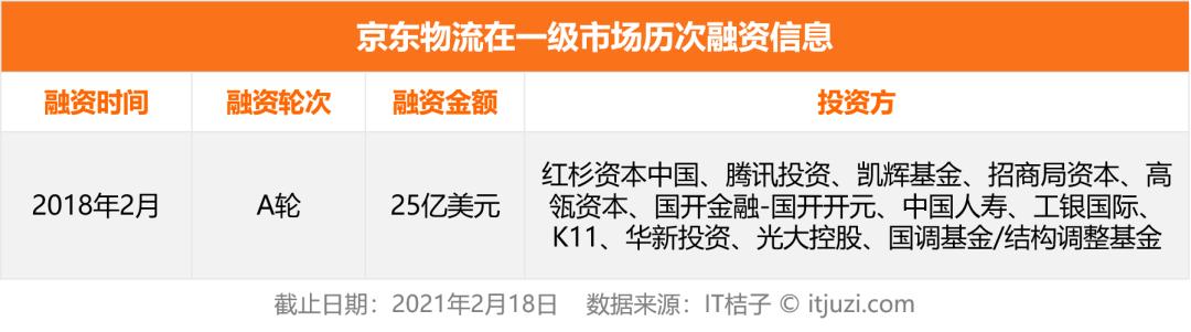 根据已公开信息,京东物流在一级市场投资方包含红杉中国、腾讯投资、凯辉基金、招商局资本、高瓴资本等,估值在 134 亿美金左右。