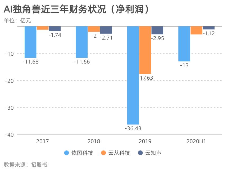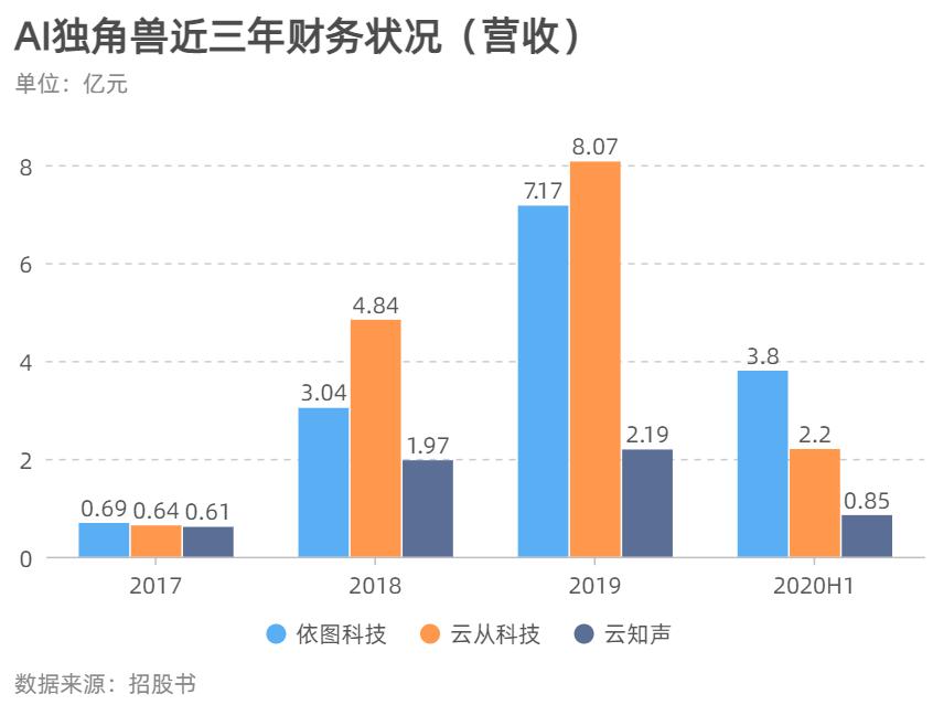 就在前几天,另外一家 AI 独角兽云知声撤回了 IPO 申请文件,但根据其此前公布的招股书,我们对其营收也得以窥探——无论是云从、依图还是云知声,连年巨额亏损是才是摆在这些 AI 独角兽面前的首道质疑。