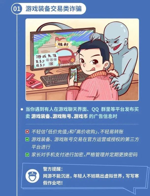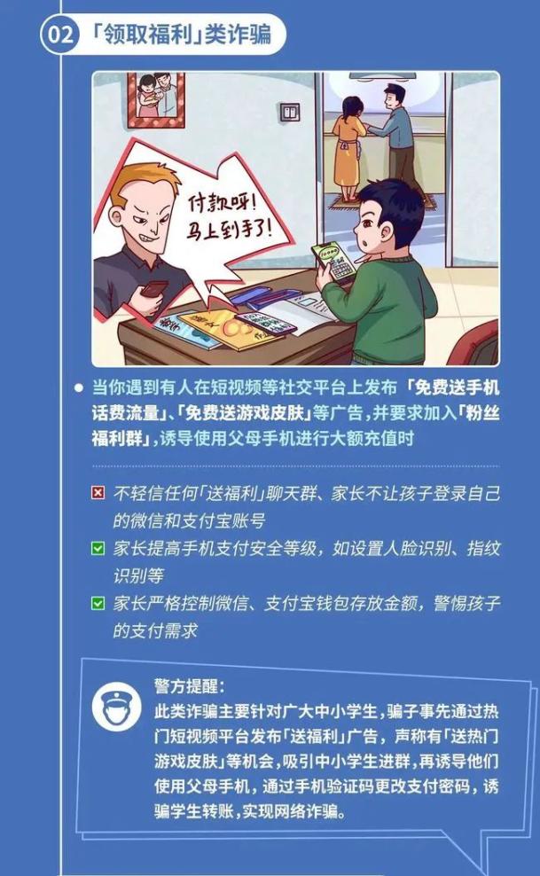 近期,我区发生多起以“赠送游戏皮肤”“低价购买商品”“解锁冻结微信”等理由,对未成年实施诈骗的犯罪活动。诈骗分子专门在未成年人聚集的游戏QQ群、微信群、短视频平台、贴吧发布虚假信息,利用未成年人涉世未深、易于操控的特点,大量添加未成年的QQ或微信,再以“打折”“返利”或“免费”为诱饵,哄骗未成年人用父母的手机进行转账,甚至对未成年进行详细指引,诱骗其将父母手机银行、支付宝花呗、支付宝借呗等账户转账透支一空。