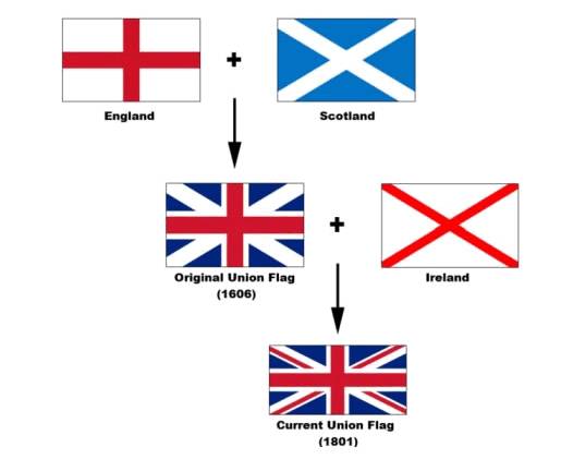 英国国旗(米字旗):旗中带白边的红色正十字代表英格兰守护神圣·乔治,白色交叉十字代表苏格兰守护神圣·安德鲁,红色交叉十字代表爱尔兰守护神圣·帕特里克。