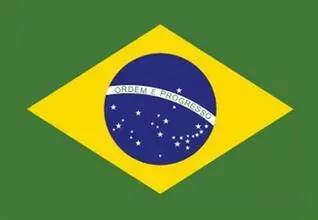 巴西国旗:旗地为绿色,中间是一个黄色菱形,其四个顶点与旗边的距离均相等。菱形中间是一个蓝色天球仪,其上有一条拱形白带。绿、黄色是巴西的国色。绿色象征该国广阔的丛林,黄色代表丰富的矿藏和资源。天球仪上的拱形白带将球面分为上下两部分,下半部象征南半球星空,其上大小不同的白色五角星代表巴西的26个州和一个联邦区。白带上用葡萄牙文写着“秩序和进步”。