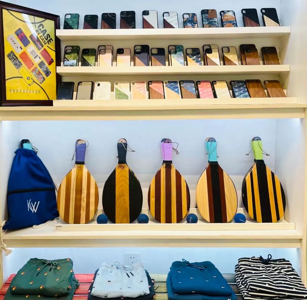 店内的眼镜框、手表链、手机壳、球拍也都是纯手工制作,融入的木质元素,无一不反映出设计师对大自然的热爱。