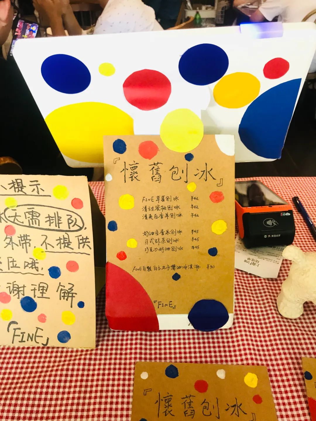 单点刨冰不提供座位。如果选择堂食,我推荐坐在临街窗边的木质桌边。头顶是传统纸灯笼和经典的水玉波点装饰,眼前是精致的复古陶瓷器皿。点一份杂莓奶油松饼,看看乌中路的斑驳树影,也许你会感叹:日剧片场不过如此。