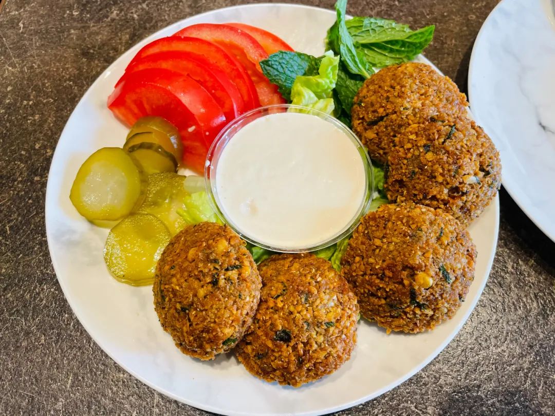 只见来自巴基斯坦的厨师在橱窗另一侧烙饼,两个阿拉伯长相的帅小伙在靠窗的吧台位悠闲地聊天、吃卷饼。另一侧,三个中国女孩子正在吃午后甜点——黎巴嫩布丁。我最心水的是法拉费沙拉。丸子由鹰嘴豆和其他豆类磨成豆泥油炸而成,口感酥脆。旁边搭配有清爽的番茄和酸黄瓜,完全不油腻。