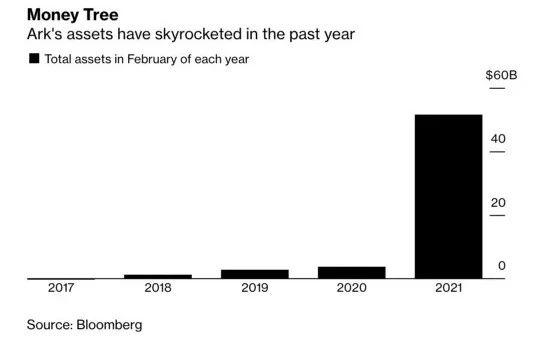 据彭博的数据显示,2021年2月初,Cathie Wood掌管的方舟投资管理的资金规模已突破500亿美元(约合人民币3233亿元),而在2020年年初,该机构所管理的资金规模仅有27亿美元,短短一年时间增长超过473亿美元,增幅超1752%。