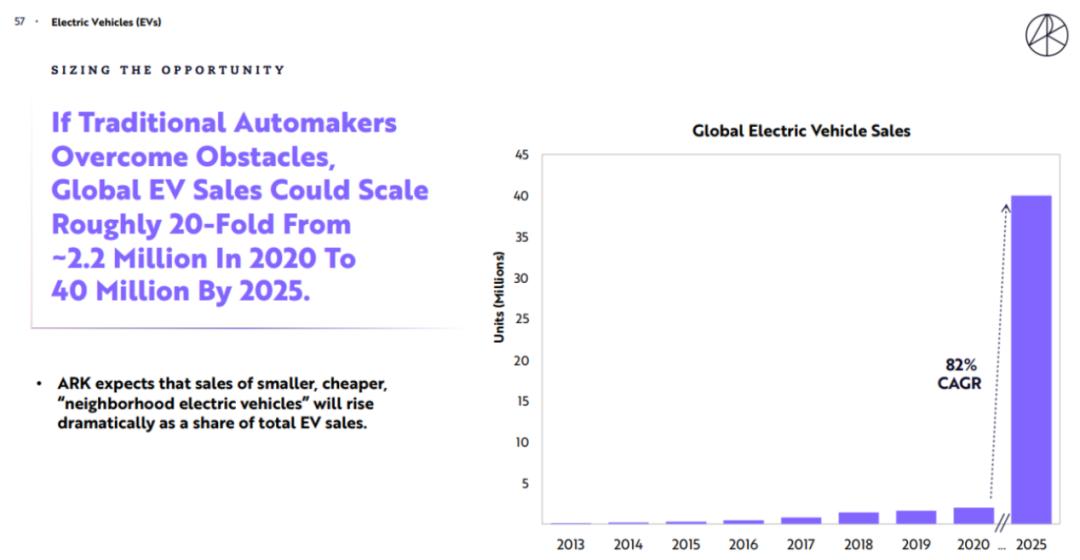 另外,Cathie Wood在2021年年初的“Big Ideas”报告中预测,根据莱特定律,电动车的销量将从2020年的220万辆左右增长到2025年的4000万,潜在的增长空间超过20倍。