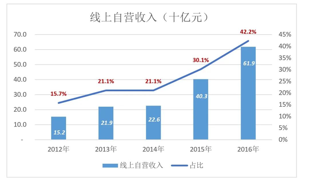 相比之下,采取“保守疗法”的国美,2016年营收767亿,其中线上自营收入107亿,占比14%。