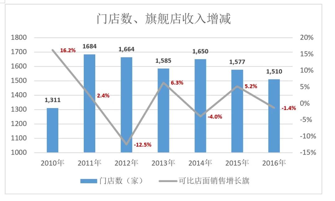 截至2016年末,苏宁门店数已降到1510间,较2011年减少174间。即便门店销售收入增长缓慢甚至出现负增长,关店的力度也非常小。