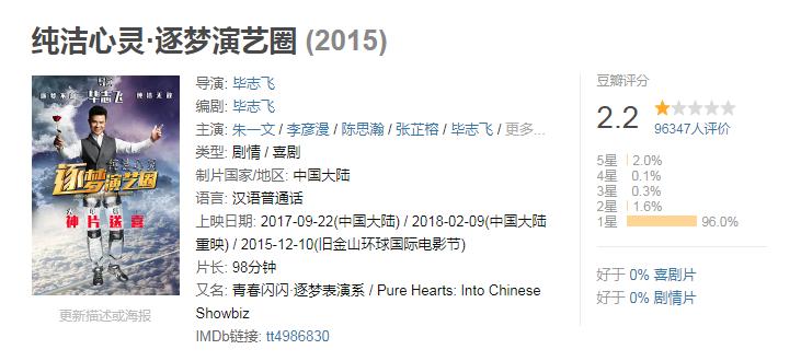 最出名的例子,还数《纯洁心灵逐梦演艺圈》创下低分纪录,一时成为豆瓣上的“史上最烂电影”。导演毕志飞一怒之下以电影出品方的身份正式起诉豆瓣。