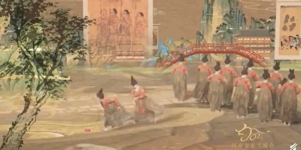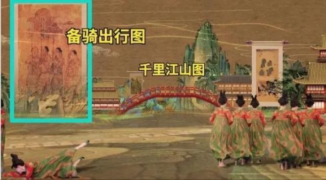 《树下美人图》《备骑出行图》《侍马图》紧接着,随着舞蹈动作的展开,屏幕里出现了三副画卷,右边是《树下美人图》,左边是《备骑出行图》,中间是《侍马图》。