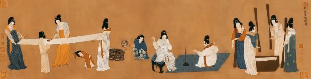《捣练图》描写宫廷妇女整理丝布的情形。