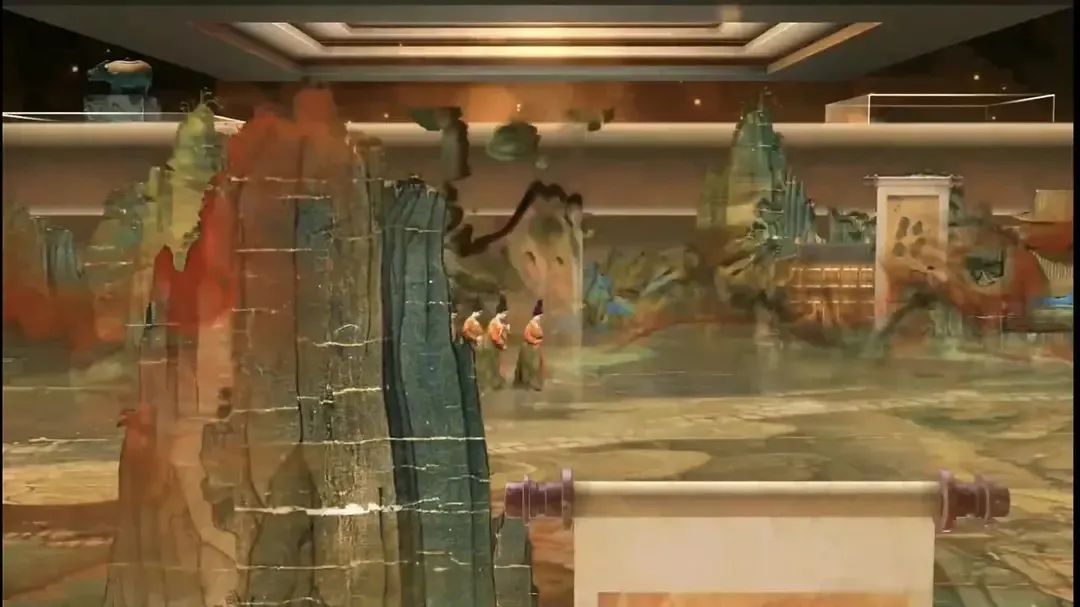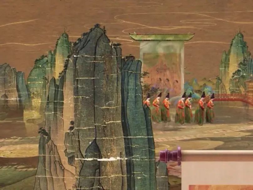 《明皇幸蜀图》接着一个转场,正前方迎面向观众徐徐而来的是唐朝李思训、李昭道父子的《明皇幸蜀图》,现藏台北故宫博物院。