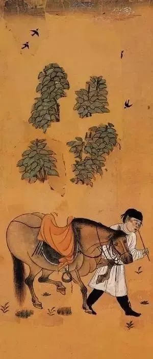 上图正中间的为《侍马图》,佚名,现藏新疆维吾尔自治区博物馆。和右边的《树下美人图》一样,也是新疆吐鲁番阿斯塔那188号墓出土。