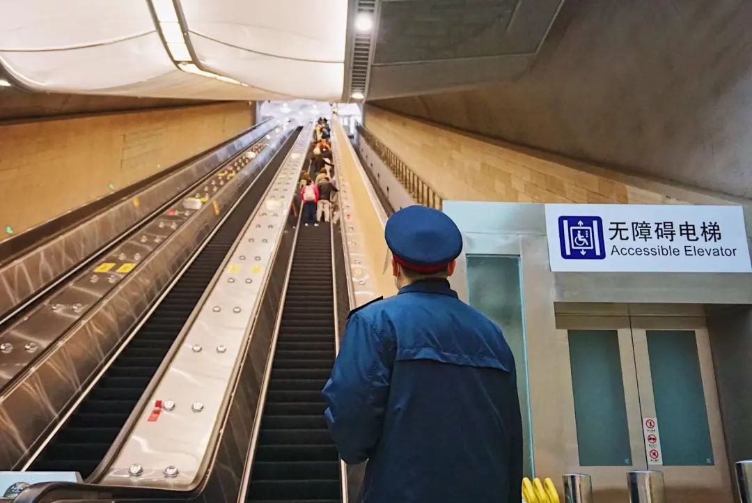 电扶梯的两侧扶手上,每隔几米就有一个紧急按钮,确保旅客遇到任何状况,都能第一时间按停电梯;电扶梯的上下处也都安排了应急值守人员,开站开梯、闭站关梯,按时维护、定期保养。