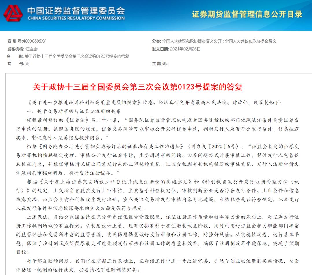 证监会2月26日发布《关于政协十三届全国委员会第三次会议第0123号提案的答复》。