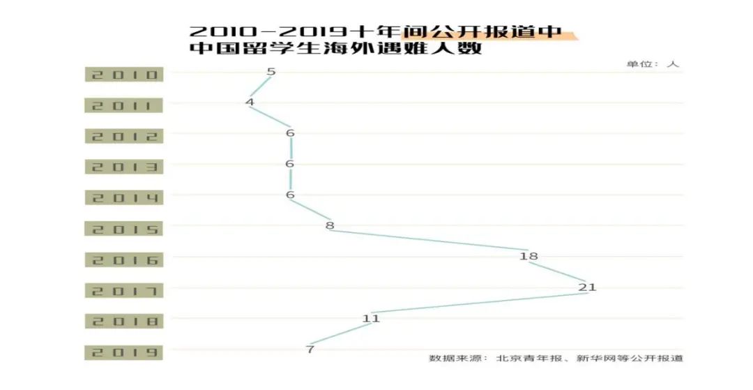 据不完全统计,从2010到2019年的十年间,至少有92名中国留学生离去,2016-2017年间遇难人数较多,分别为18人和21人。其中,江歌案、章莹颖案影响广泛,令人扼腕叹息。