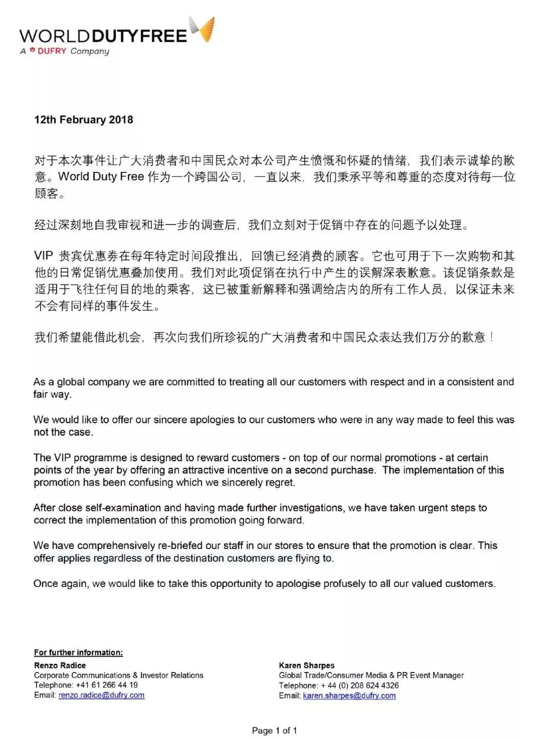对此免税店已经公开致歉,但是国人的怒火却并没有减退,因为道歉原文通篇没有提CHINA。
