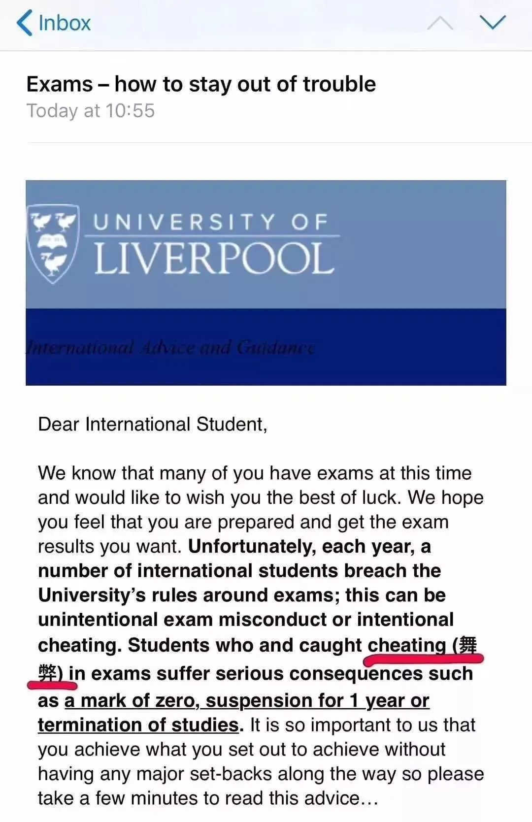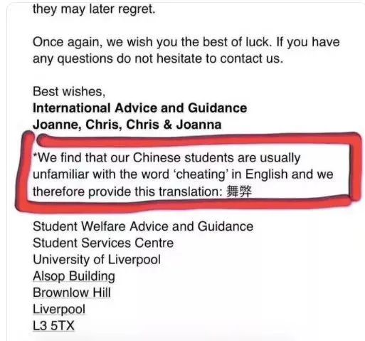 而2019年,英国利物浦大学也被曝出涉嫌歧视中国学生。在学校致国际学生的一封信中,提醒学生考试作弊的严重后果。关键是,在英文单词“cheating”后专门用中文标注,格外显眼。
