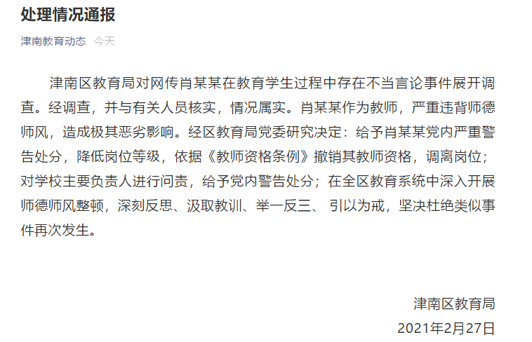 2021年2月25日,网传天津津南区教师肖某某在教育学生过程中有不当言论。区教育局立即成立调查组,对网传情况开展核查。目前,该教师已被停职。教育局将根据调查结果依法依规严肃处理,并及时向社会公布。