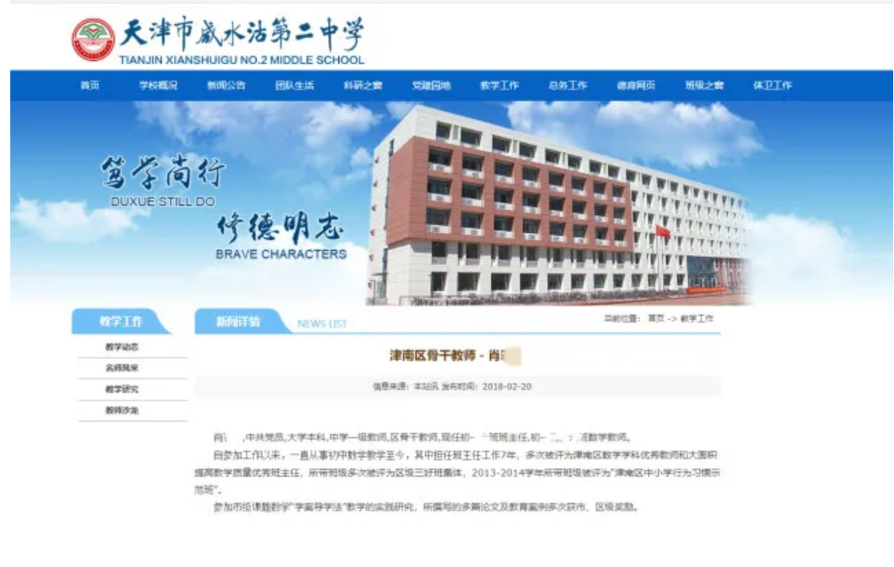 据九派新闻,记者查询学校官方发现,这名教师大学本科,系中学一级教师,区骨干教师,历任班主任、数学教师。