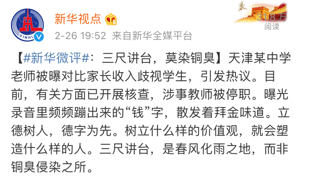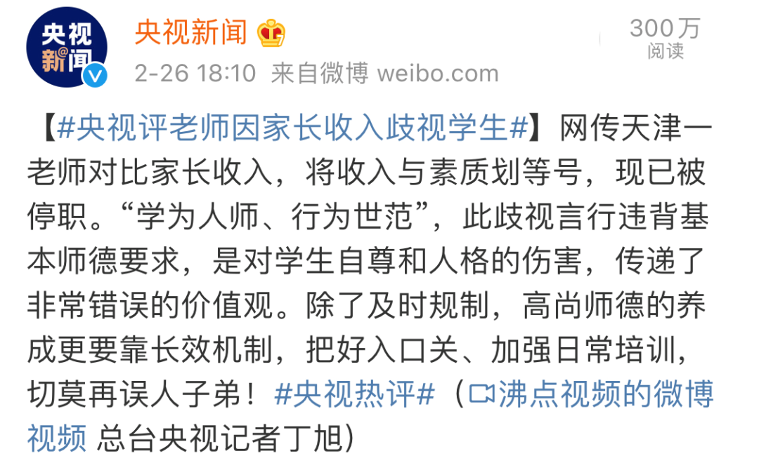 @央视新闻 2月26日消息,“学为人师、行为世范”,此歧视言行违背基本师德要求,是对学生自尊和人格的伤害,传递了非常错误的价值观。除了及时规制,高尚师德的养成更要靠长效机制,把好入口关、加强日常培训,切莫再误人子弟!