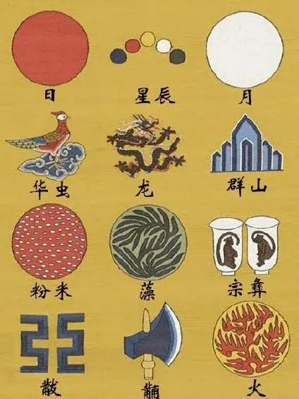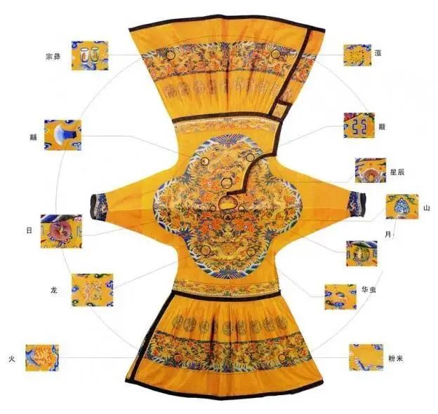 皇帝的龙袍上绣有日、月、星、辰、山、龙、华虫、宗彝、水草、火、粉米、黼、黻,取九五之尊之意,是最高等级的纹饰。