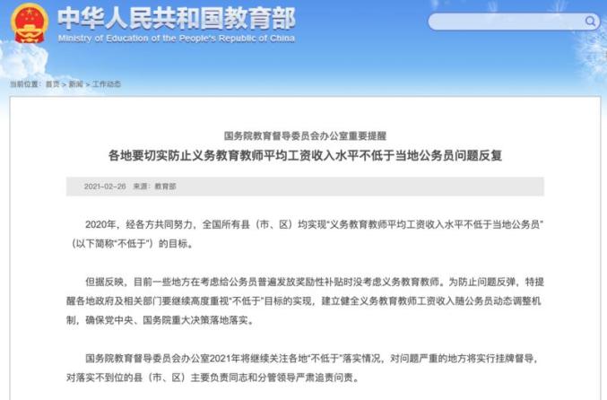 记者2月26日从教育部获悉,2020年,经各方共同努力,全国所有县(市、区)均实现“义务教育教师平均工资收入水平不低于当地公务员”(以下简称“不低于”)的目标。但据反映,目前一些地方在考虑给公务员普遍发放奖励性补贴时没考虑义务教育教师。为防止问题反弹,国务院教育督导委员会办公室提醒各地政府及相关部门,要继续高度重视“不低于”目标的实现,建立健全义务教育教师工资收入随公务员动态调整机制,确保党中央、国务院重大决策落地落实。