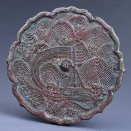 航海铜镜1972年,陕西扶风县城关镇下河村宋墓出土了一枚独特的石家湖州镜,这是一枚北宋航海铜镜,被定为国家一级文物,现藏于扶风县博物馆。此镜直径17.8厘米,重600克。八瓣菱花缘棱起。镜背半球形钮,钮面饰星云点。钮外有浮雕海上航船图案,纹样以流畅的细阴线表现起伏翻滚的波涛,一单桅杆帆船乘风破浪航行在大海波涛中。船头三人并立前望,船尾有艄公三人用力划着桨。船舱口探出几个人头,图案布局紧凑生动,看着画面使人似乎身临其境,俨然是一幅海上远航图。这面铜镜背面船帆上阴刻有铭文:“胡(湖)州仪凤桥南石家”。对于这面铜镜,有些学者认为它可能是对鉴真东渡日本传播佛教的生动写照,所以曾远赴日本参加精品文物展览。它对于研究宋代的航海情况和对外文化交流有重要的史料价值。航海纹,也映射着一个属于中国的大航海时代,湖州宋代的石家镜就这样扬帆出海,走出国门,走向世界。两宋,尤其是南宋海外贸易空前繁荣,湖州镜也随之远销到日本、朝鲜等地,成为古代海上丝绸之路上出自湖州的大宗商品之一。著名的南海1号出土的铜镜,有关专家研究后认为极有可能就是湖州镜。