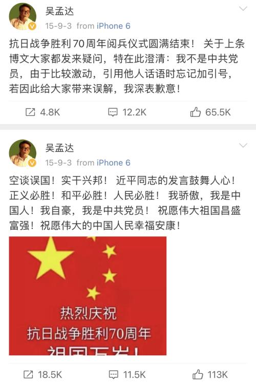 作为一名出生于内地,成长在香港的中国人,吴孟达一直为祖国感到骄傲,微博曾多次转发过相关内容。