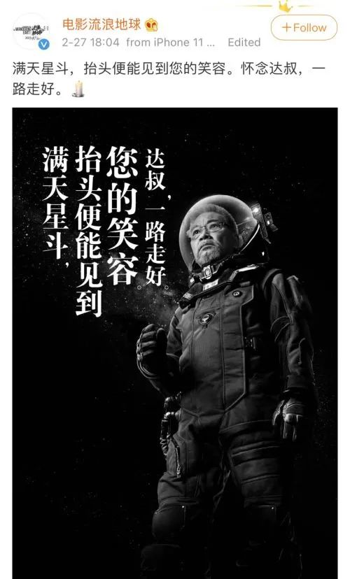 @电影流浪地球 更是为此发布角色海报,深情感慨:“满天星斗,抬头便能见到你的笑容。”