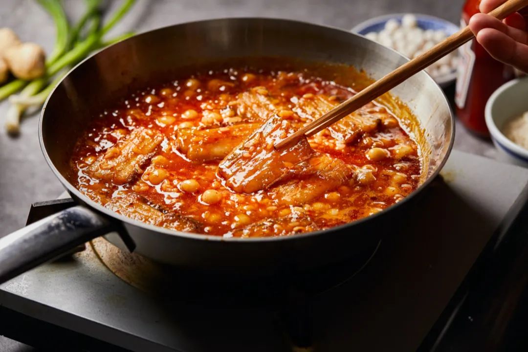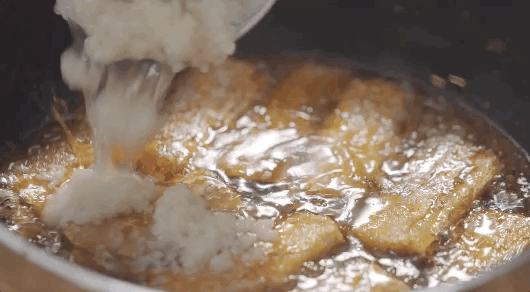 倒入生抽、糖、盐、米醋和酒酿,可根据情况适量加入少许温水,期间不加锅盖,持续晃动锅身,让汤汁均匀包裹住每一块带鱼。