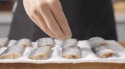 选用肉质厚实的东海带鱼,清水洗净后将少量盐涂抹表面,用厨房纸吸干水分。如果买的是整条带鱼,剪去鱼头鱼尾和鱼鳍,从靠近鱼鳃地方纵向划一刀,将内脏去除并把黑线清理干净即可切段。
