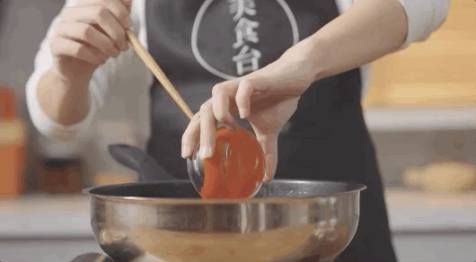 底油不要倒,将拍散的姜蒜放入炒香后捞出,加入事先准备好的番茄辣酱煸出香味,放入带鱼翻炒几下。
