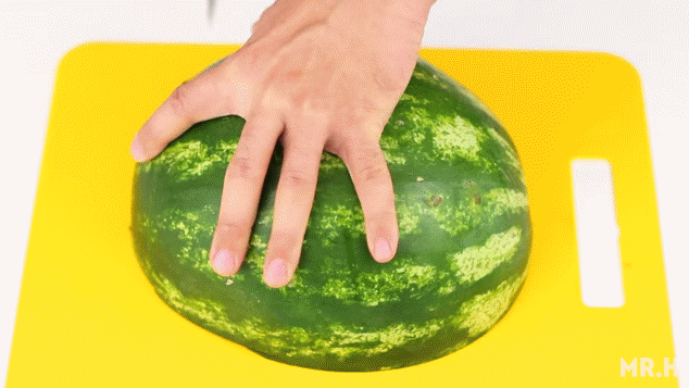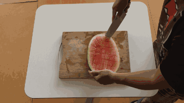 首先将大西瓜一分为二,倒扣在切菜板上,然后横着切几刀,竖着切几刀,把西瓜切成小块,就可以直接上手吃了,完全不脏手~