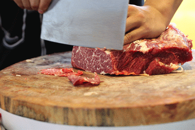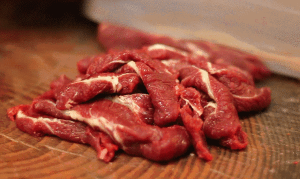牛羊肉切的时候要逆着肉的纹理切,让刀和肉的纹理呈90度的垂直,切出来的肉片,纹路呈“井”字状,如果顺着纹理切,就很容易咬不动;
