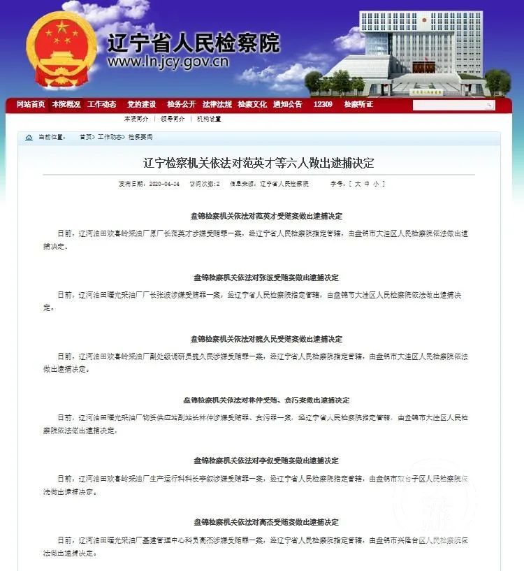 2020年4月24日,辽宁检察机关公布对中石油辽河油田系统6人的逮捕决定。/辽宁省检察院