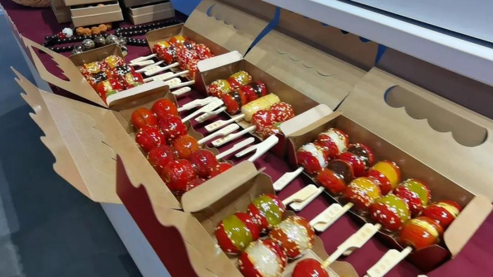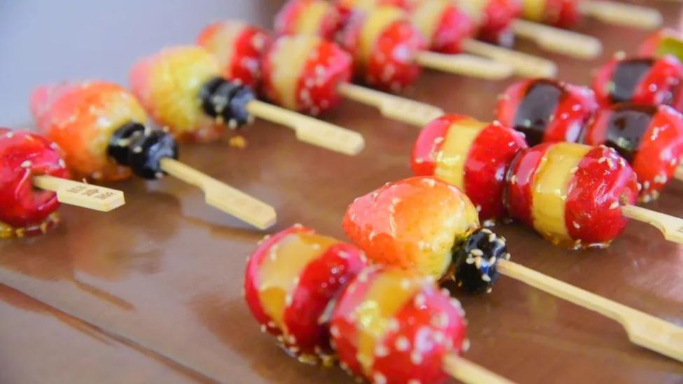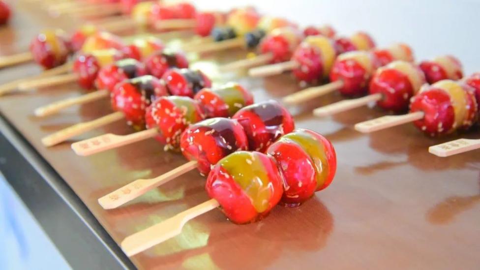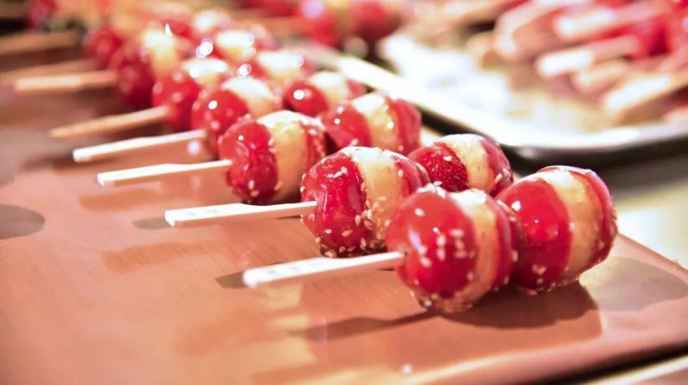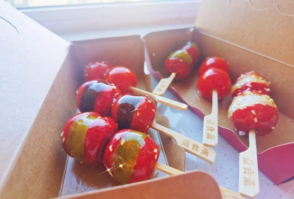 作为古法传承的传统手艺,益食斋冰糖葫芦选材考究,口味多样,经清洗、烘干、去籽、穿串、夹馅、裹糖、撒芝麻等复杂工序制作而成的冰糖葫芦,个个透红鲜亮、圆润饱满,一缕缕晶莹剔透的糖丝在色泽诱人的夹心水果间缠绕。
